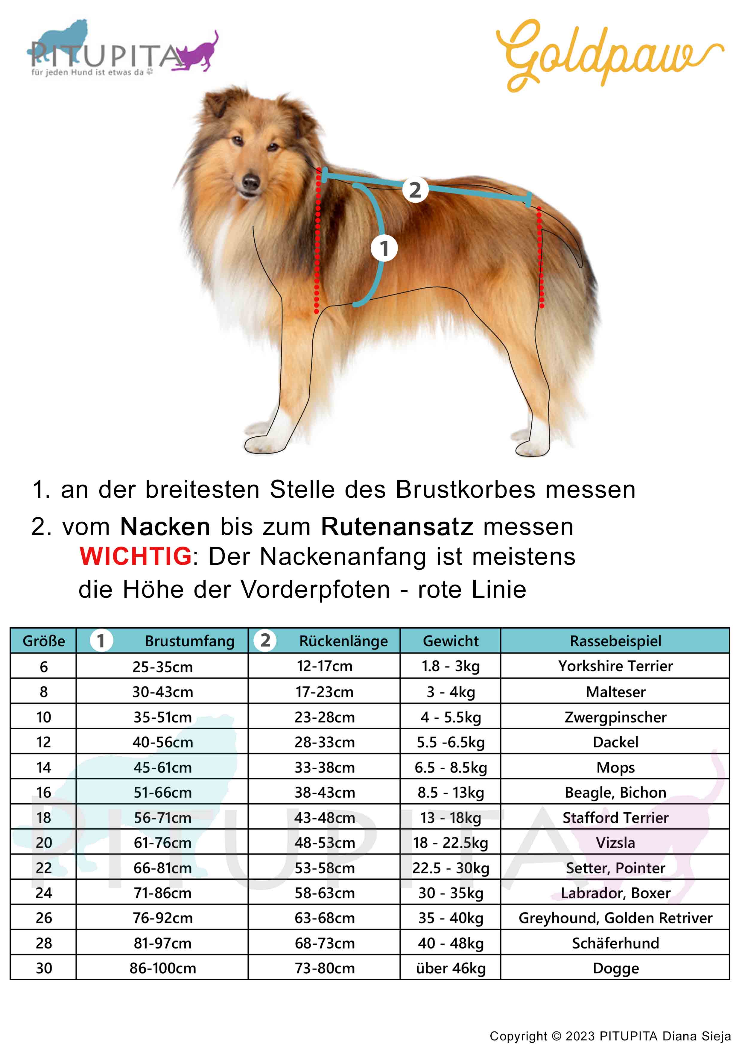 | Größe | Rückenlänge in cm | Brustumfang in cm | Gewicht in kg | Rassebeispiel |