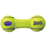 Eine Kombination aus zwei beliebte Hundespielzeuge – Tennisball und Quietscher – zum perfekten Apportierspielzeug in Form eines Knochens.