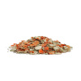 Möhrenflocken, Erbsenflocken, Luzerne Pellets, Kräutermischung (Petersilie, Brennnesselkraut), Fruchtmischung (Apfel, Pfirsich, Bananenwürfel), Reismehl
