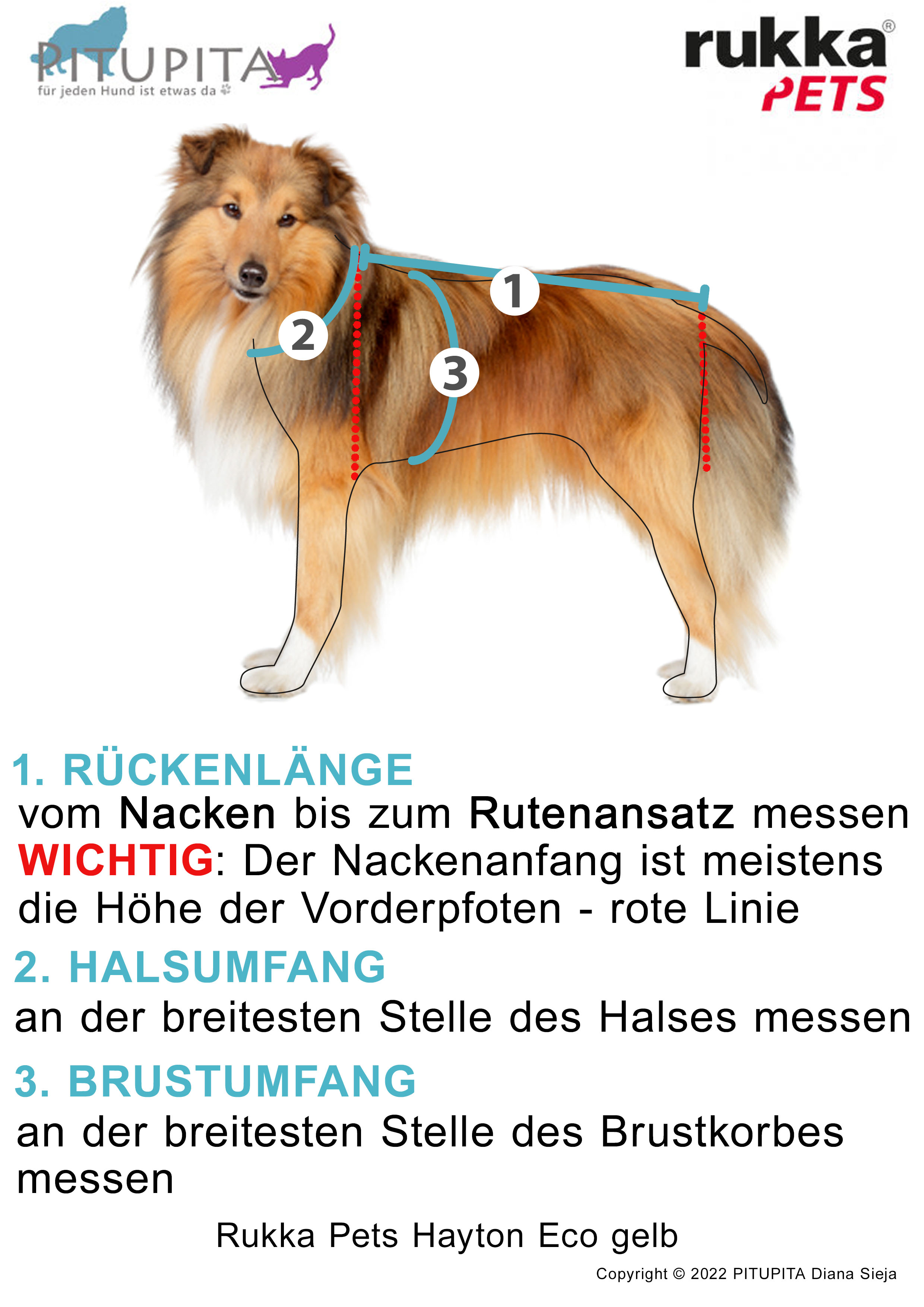 | Größe | Rückenlänge in cm | Halsumfang in cm | Brustumfang in cm |